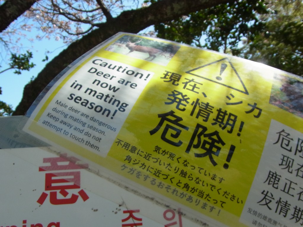 Nara die Stadt der Hirschen. Im 500 Hektar grossen Park, dem kulturellen Herz Naras, liegen die meisten Tempel und über 1200 zahme Hirsche, die als Götterboten betrachtet werden, streifen umher. Mich hat es ein bisschen gegruselt. Zu viele Hirschen für mein Befinden. Sie sahen auch eher krank aus. Dieses Hirschwild wandert seit Jahrhunderten im Nara-Park umher und bettelt die Besucher um Futter an. (und es hat viele Besucher) Futter muss gekauft werden. Man kann nicht einfach etwas geben. Riesenbusiness. Kostet doch ein Futterpäckchen Yen 300. ca. CHF 2.00.