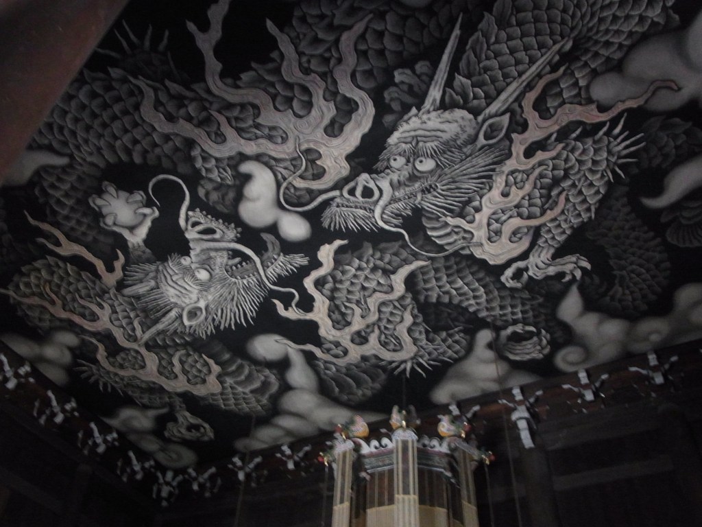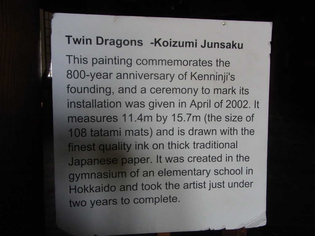 Zurück in Kyoto habe ich mir den Zen-Temple Kennin-ji angeschaut. Es war ruhig und schön. Nach der Hektik des Nara-Parks. Es ist ein schöner Ort – fast ein Gemeintipp. Er bildet einen angenehmen Kontrast zum Ausgehviertel Gion. (in der Nähe) Seine weitläufigen Gärten sind wunderschön. Beeindruckend auch die gemalten Zwillingsdrachen am Dach der Hodo-Halle. Nebengebäude. Leider war mir die Lust vergangen noch durchs Gion-Viertel zu schlendern. Ich war einfach zu müde. Morgen.