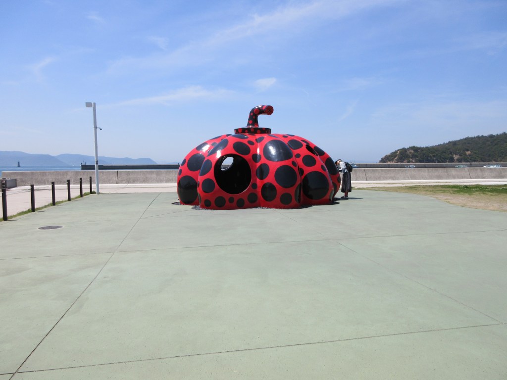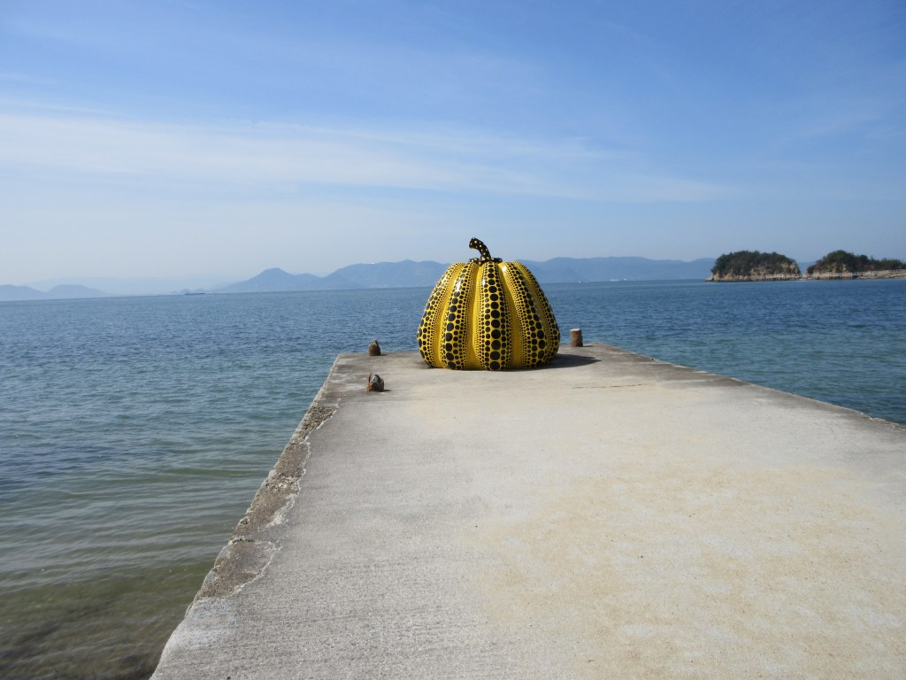 Der berühmte gelbe Kürbis der japanischen Künstlerin Yayoi Kusama – Kusuma schätzt die Kürbisse wegen ihres üppigen Wachstums. Der rote Kürbis am Fährhafen.