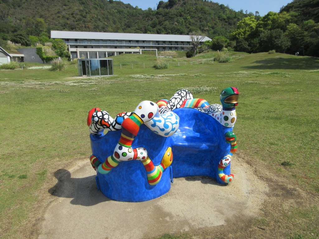Insel der Kunst – ist eine grosse Touristenattraktion. Sie bietet den Besuchern die einzigartige Möglichkeit, beste zeitgenössische Kunst, nicht nur japanische Kunst, in malerischer Natur zu sehen. Ins Leben gerufen wurde das Benesse-Projekt in den frühen 1990-er Jahren, als die Benesse Corperation die Insel als Ausstellungsort für ihre wachsende Sammlung moderner Kunst erwählte. Der Medienmogul Soichiro Fukutake, Besitzer der globalen Bildungskonzerne Benesse und Berlitz, nahm den Südteil der Insel unter seine Fittiche. Der Architekt und Pritzkerpreisträger Tadao Ando durfte im Direktauftrag nicht nur eine exklusive, in ein kleines Tal eingebettete Hotelanlage planen, sondern auch ein Museum für Fukutakes umfangreiche Privatsammlung moderner und zeitgenössischer Kunst.