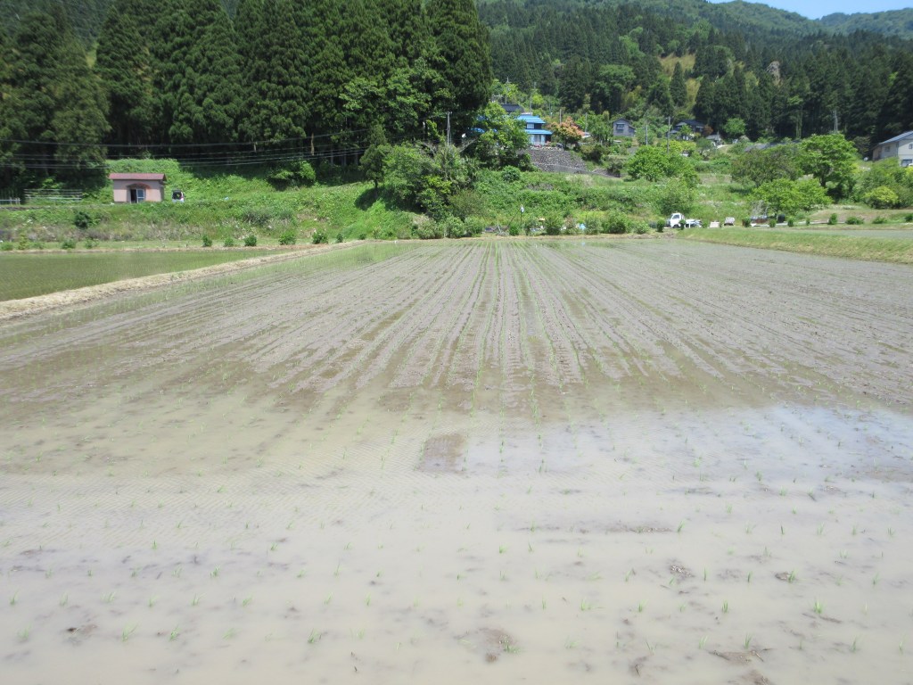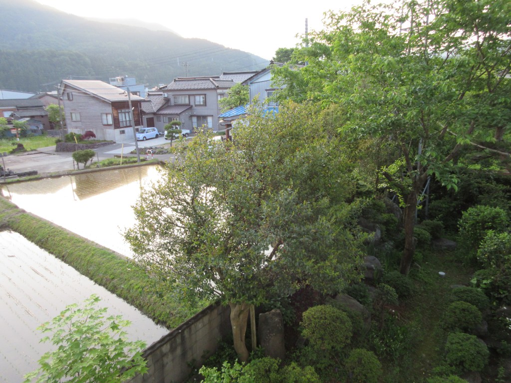 Kleines Reisfeld vor meinem Schlafzimmerfenster bei Keiko-san. Frösche waren die grosse Ruhestörung während der Nacht. Nun sieht man in den Reisfeldern die Kaulquappen.