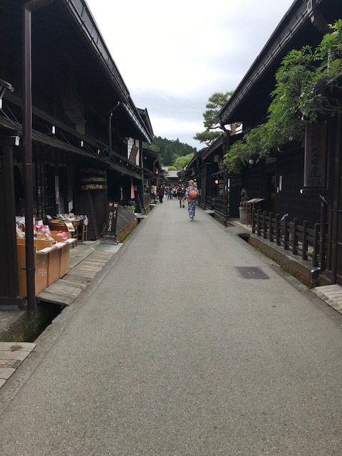 Endlich nach ungefähr 4 Stunden in Takayama angekommen. Takayama liegt mitten in den Bergen. Die Stadt mit den reichen Holzressourcen brachte gutausgebildete Zimmerleute hervor. Dank der sehr abgeschiedenen Lage blieben hier ganze Strassen aus der Edo-Zeit erhalten. Im Buch Lonley Planet von 2019 steht, dass es viele winzige Läden, Galerien und Restaurants sowie Museen gibt. Leider ist dem nicht mehr so. Ein paar Läden mit Souvenirs, 2 Museen geschlossen – im Moment für immer – Galerien habe ich keine entdeckt. Tempel sind alle noch da.