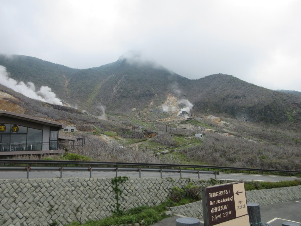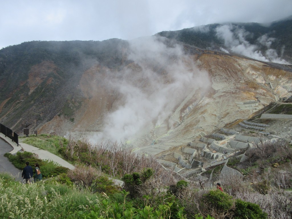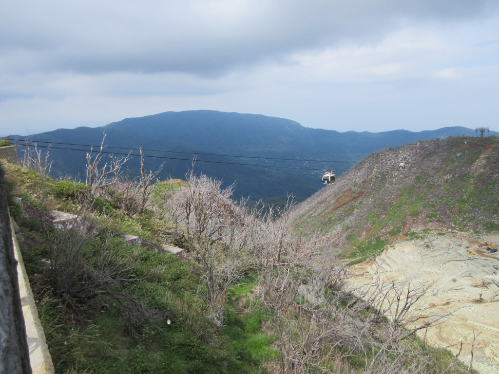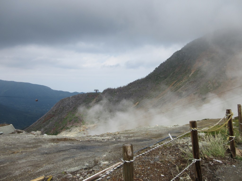 Mit der Tozan Bahn geht es bergauf durch Bergwälder und Schluchten. Mit der Seilbahn weiter über den Kamm zum faszinierenden Owaku-dani – Tal des grossen Dampfes – einer Gegend voller Schwefeldämpfe.