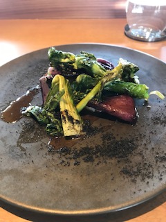 Hauptgang. Rindfleisch vom Grill mit japanischem Gemüse und grüne Spargeln.