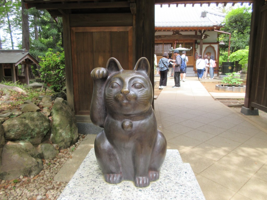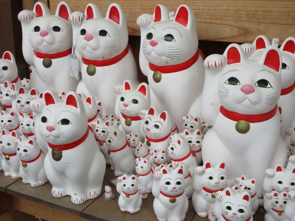 Gotokuji: Der Winkekatzen Tempel. Der Gotokuji ist der berühmte Winkekatzen-Tempel im Westen Tokios. Er bietet, neben den süssen winkenden Katzen (Maneki Neko), schöne japanische Bauten und liegt etwas abseits der üblichen Touristenpfade. Legenden besagen, dass die Winkekatze ihren Ursprung in der Edo-Zeit hatte, als ein armer Mönch Streunerkatzen in seinem Tempel aufnahm. Zu der Zeit besuchte Fürst Naotaka li aus Hikone (nördlich von Kyoto) den Heruntergekommenen Tempel und rastete in der Nähe unter einem nächtigen Baum. Plötzlich entdeckte er am Eingang des Tempels eine Katze, die ihn mit einer Winkebewegungen zu sich lockte. Neugierig folgte der Fürst der Einladung der Katze. Kurz darauf wurde der Baum von einem Blitz getroffen und ging in Flammen auf. Aus Dankbarkeit liess er den Tempel renovieren und ihn in seinen Familientempel verwandelte. Die Geschichte verbreitete sich schnell. Die Bevölkerung fing dem Tempel Winkekatzen-Figuren aus Ton zu schenken, sobald sich ein Wunsch von ihnen erfüllte.