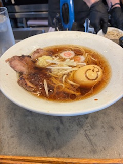 Hühnerbrühe mit Toppings ohne Nuriblätter für mich (mag ich nicht so) gehört jedoch immer dazu. Ei weichgekocht und mit einem Brenneisen Stempel aufgedrückt (Label der Küche) und wie oben erwähnt die verschiedenen Toppings.
