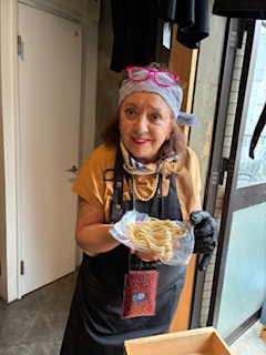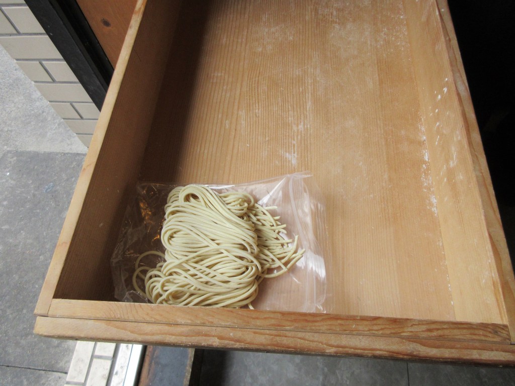 Nudeln haben wir selbst gemacht. Mehl und Wasser. Arbeitsaufwendig. Muss nicht sein. Frische Rahmennudeln gibt es in jedem Asia-Shop. 🙂