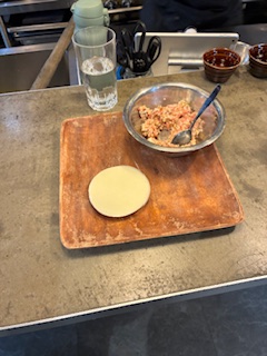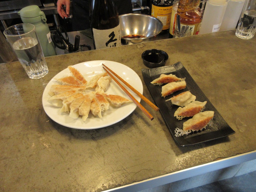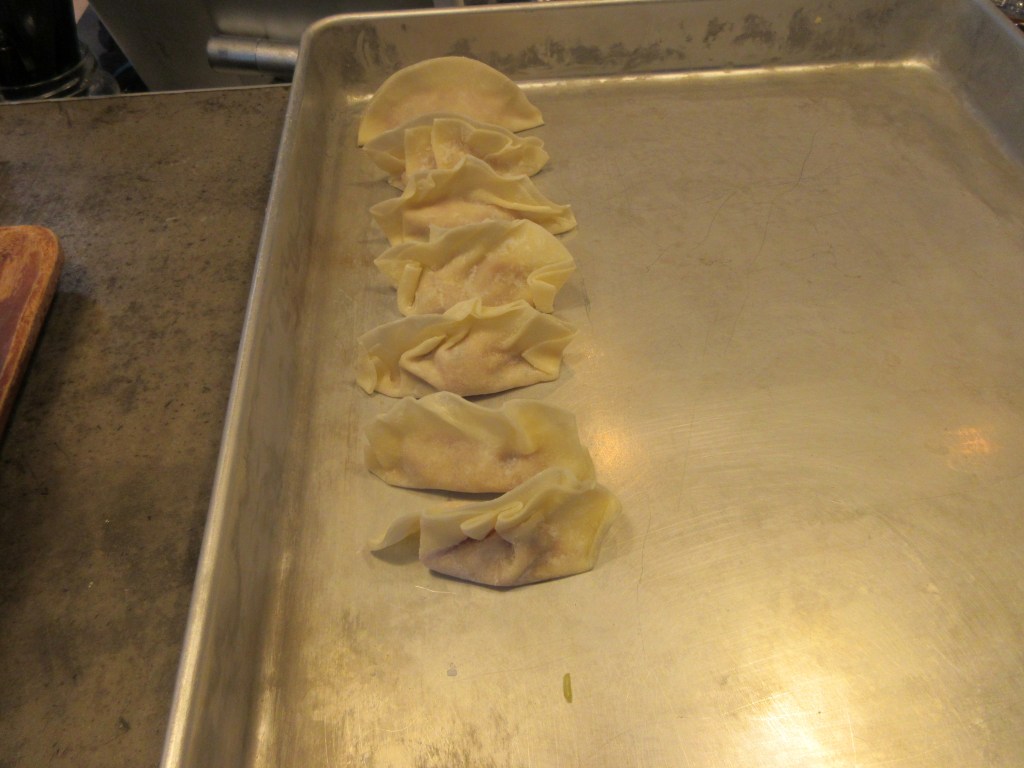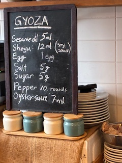 Teigplätzchen kann in Asia-Shops gefunden werden. Japaner Koch Saito-san sagte mir es lohne sich nicht die selbst zu machen. Ein bisschen Übung braucht es schon um die Füllung in die Rondellen zu platziern und schöne Gyozas zu „falten“.