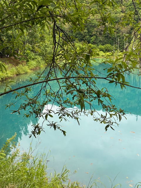 Nun zum blauen Teich. Der blaue Teich (Aoiike) befindet sich nahe der Stadt Biei und ist auf dem Weg nach Asahikawa. Er ist für seine aussergewöhnliche Farbe und die im Wasser stehenden Bäume bekannt. Der Teich entstand eher zufällig, nachdem am Biei Fluss Bauarbeiten zu einem Damm durchgeführt wurden , um die nahegelegene Stadt vor Schlammlawinen durch den nahen Tokachi Vulkan zu schützen. So wurde ein Teil des dortigen Waldes überschwemmt und bildet seither den Teich. Die Besonderheit ist das kobaltblaue Wasser, dessen Farbe durch das enthaltene Aluminiumhydroxid entsteht und dem Teich seinen Namen verleiht. Bis vor einigen Jahren war er noch keine Touristenatraktion, gewinnt aber vor allem durch soziale Medien immer mehr an Aufmerksamkeit.